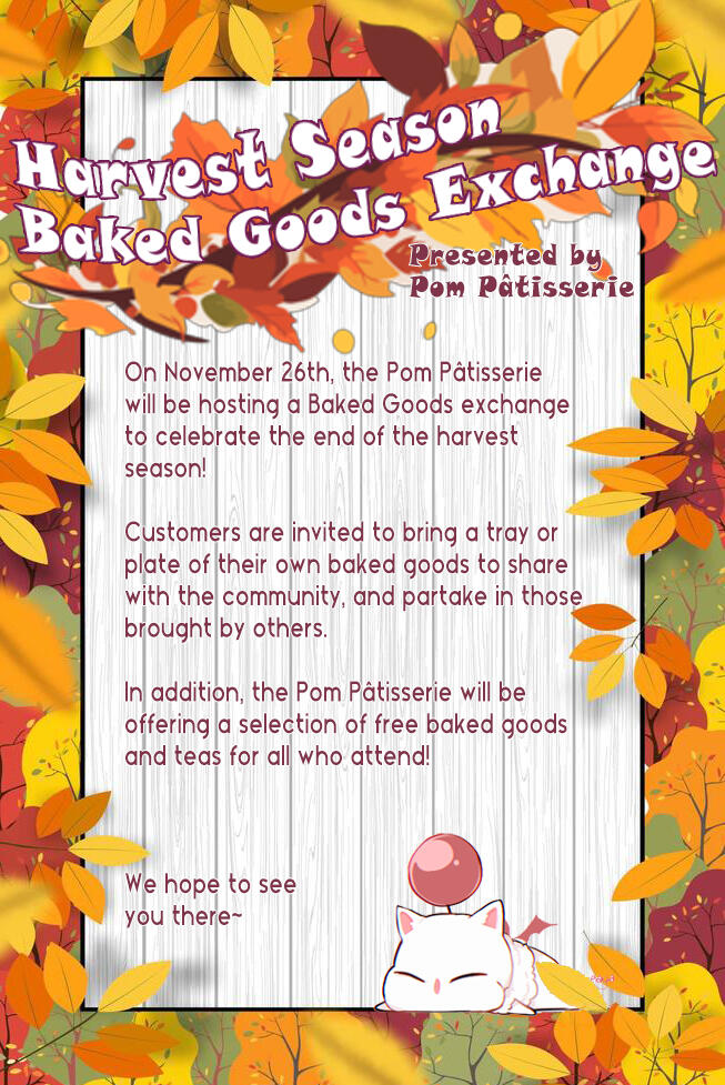 Welcome to Pom Pâtisserie!~ Where you can enjoy a blend of traditional Ishgardian and Gridanian breads, pastries, and drinks made with ingredients sourced locally by the Moogles of the Twelveswood and Moghome!